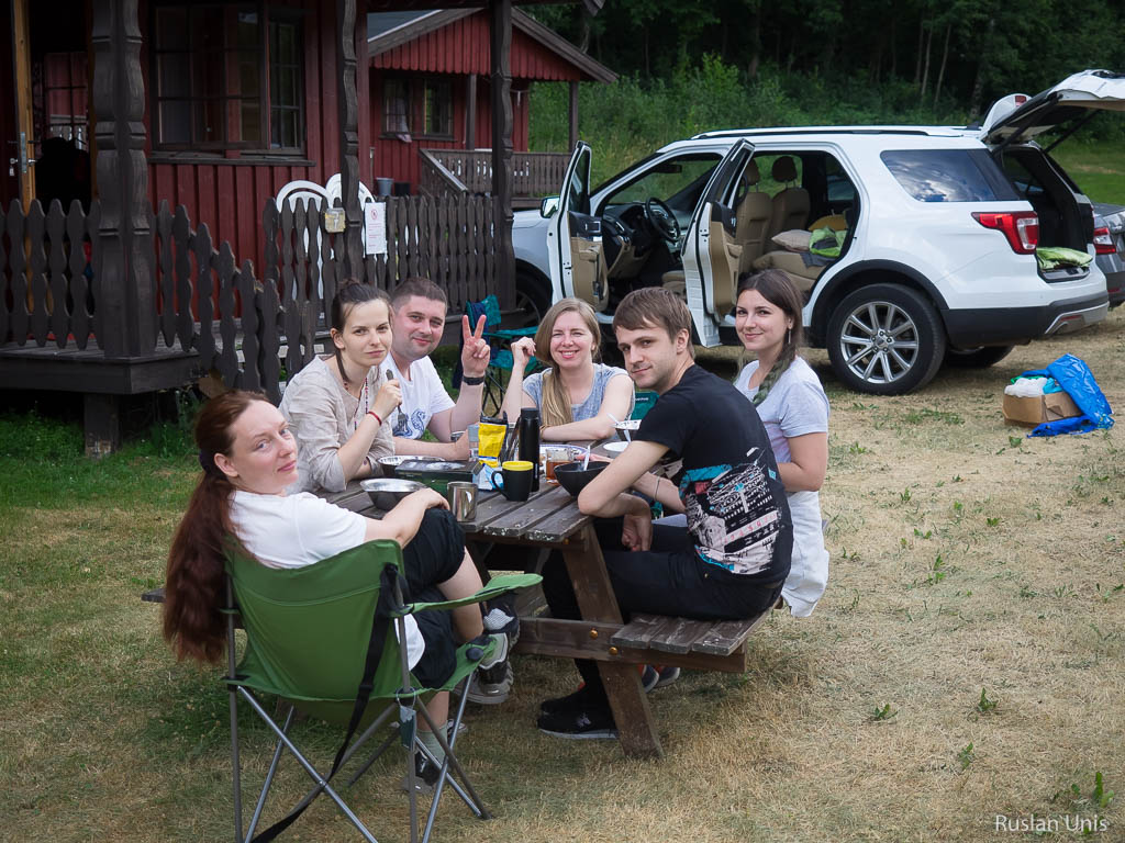 Мы взяли с собой газовую плитку с баллонами, стол со стульями, канистры с водой, чайники. А половина багажника была занята продуктами. Больше всего было разных консерв: шпроты, кильки, супы, тушенка, куриное мясо, пара паштетов и еще что-то. Каши и лапша быстрого приготовления, куда же без них. Были макароны, которые готовятся 3 минуты. Обязательная гречка, она быстро готовится, полезная и вкусная. Купили снеков и сладкое к чаю: арахис, сладкие палочки, сушки, печенье, вафли. Всего продуктов на семерых у нас было на 25-30 тысяч рублей. Обеды были в виде коротких перекусов, чтобы не тратить время в пути, а завтраки и ужины готовили на огне подольше. Кстати, воды много брать с собой смысла нет. В Финляндии, Швеции и Норвегии вода из под крана чистая настолько, что ее можно пить. Мы набирали воду даже из горных ручьев во время трекинга. Просто берите удобные бутылочки и все.