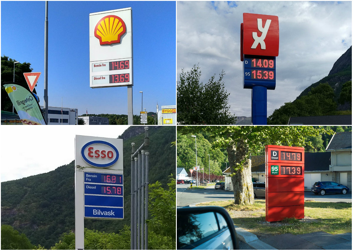 Меня удивил разброс цен на разных заправочных станциях Норвегии. Он в пересчете на рубли мог быть более 11 рублей за литр! Самый дешевый бензин в кронах стоил 14,40, а самый дорогой 17,39, хотя чаще всего цена встречалась цена около 16,80. Можете себе представить такую разницу в России? Особенно чувствительно это может быть, если заправлять полный бак. Например, объем бака нашего Ford Explorer 80 литров, а при наших пробегах заправки были частыми. Так что если увидели цену ниже 16 крон за литр — сразу заправляйтесь, даже если топлива в баке больше половины. Дизель стоит в среднем на крону дешевле, но разброс в ценах тоже ощутимый.