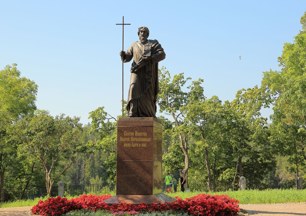 Недалеко от Святых Врат монастыря – памятник Андрею Первозванному. Один из 12 апостолов, Андрей Первозванный первым призван Иисусом Христом для проповеди Евангелия. Путешествуя из Крыма в Рим через Ладогу, апостол Андрей ступил на острова Валаамского архипелага. В 2003 году на Валаам из Греции принесены мощи апостола Андрея, имя которого почитается на Руси. Памятник первому ученику Христову в 2014 году освятил на Валааме Патриарх Московский и всея Руси Кирилл.