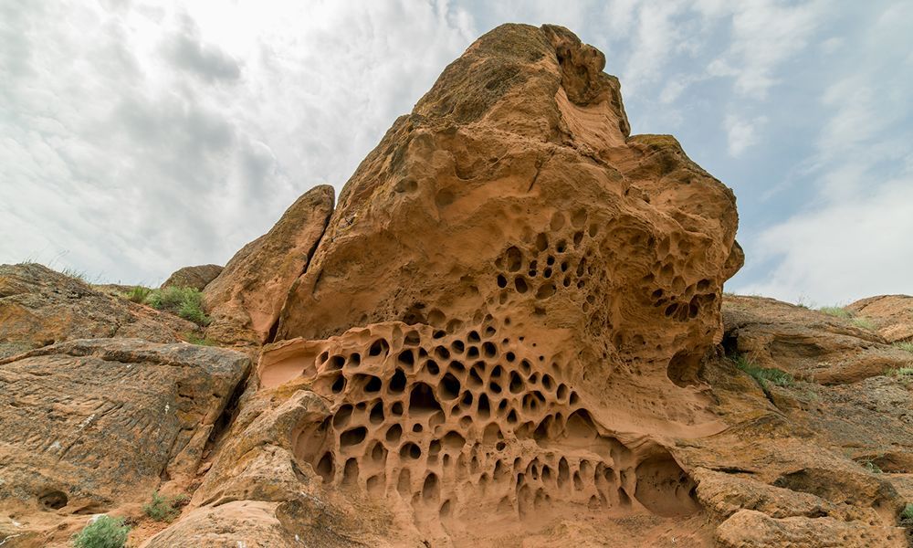 Высота ее – всего 149 метров. Поражает необычный цвет слоистых пород, меняющих палитру в разное время суток, при солнечной погоде и в пасмурные дни. В горе находятся более 30 пещер, балки, воронки, гроты, сквозные отверстия соты, издающие в ветреную погоду необычные звуки, за что Большое Богдо называют Поющими скалами. Для буддистов эта гора – священное место.