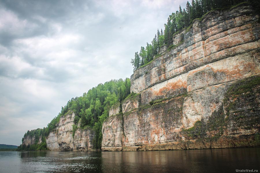 Еще полчаса и вот мы уже под монументальной стеной махины Ветлана. Из всех трех самых крупных скал Вишеры (другие — Писанный и Говорливый) Ветлан самый высокий — по некоторым данным над урезом воды он возвышается на 142 метра! А сама длина стены без малого 1750 метров! Как и другие большие скалы, он стоит на излучине реки, из-за чего создается ощущение, что река упирается в него.