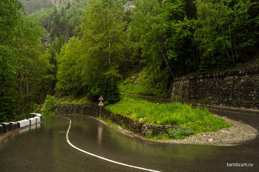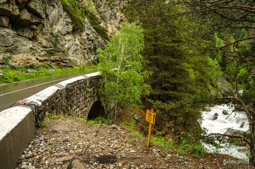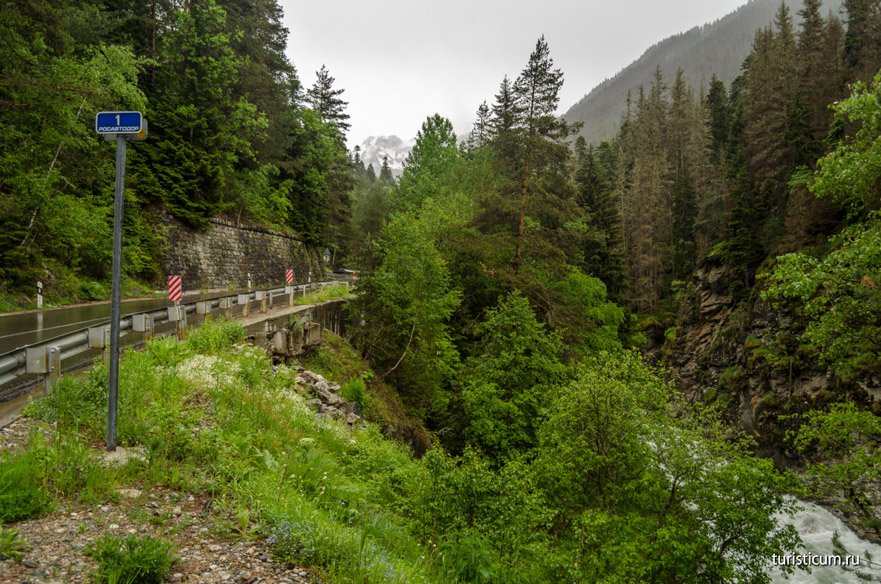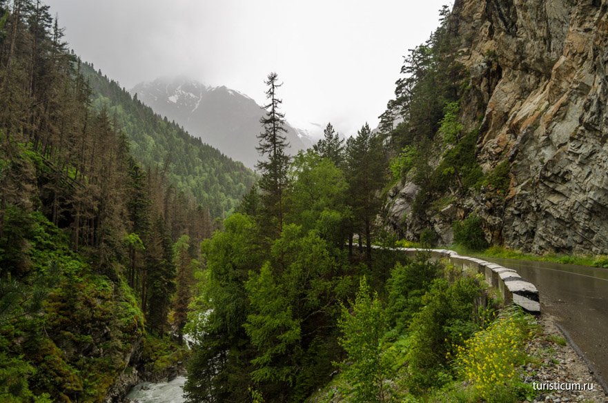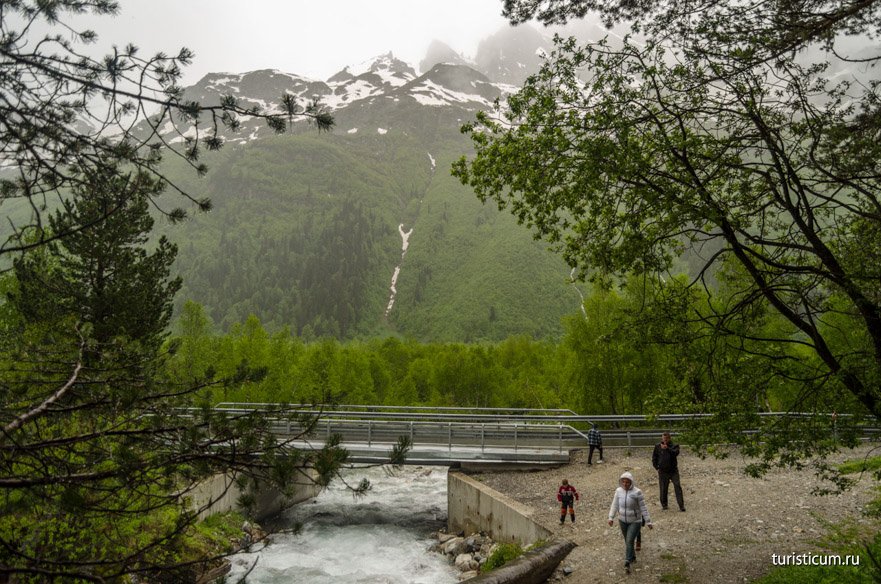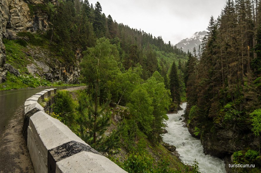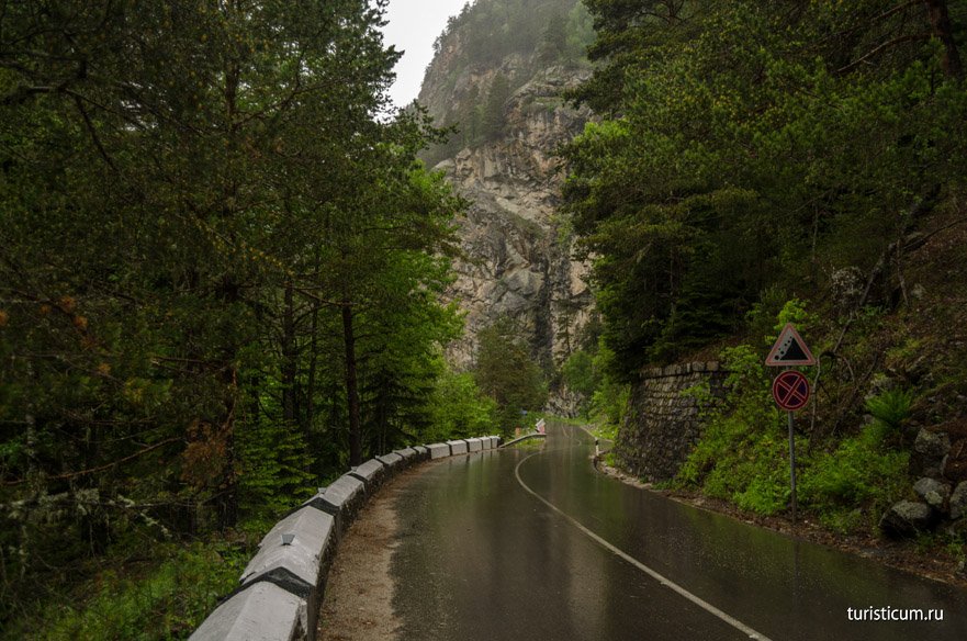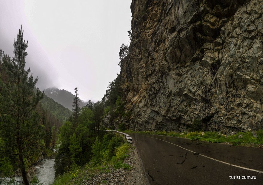 От Домбайской поляны до съезда в Гоначхирское ущелье 7 километров, а от поселка Теберда чуть более 13 километров.