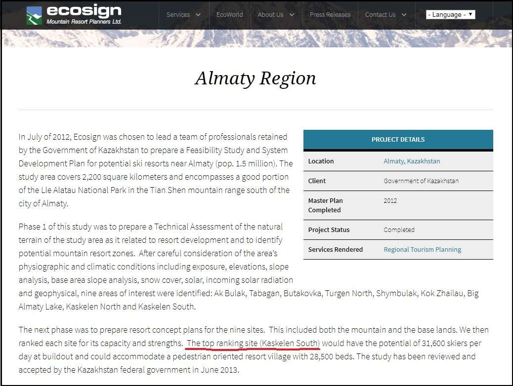 Б. Байбек объявил о возобновлении проекта курорта «Кокжайлау» 9 ноября 2017 года. Это случилось на следующий день после подписания договора на разработку ТЭО (технико-экономического обоснования строительства курорта) между управлением туризма и ТОО «Almaty Mountain Resorts». То есть общественность поставили перед фактом. А спустя год, 4 ноября 2018-го, на общественных слушаниях рассматривался единственный безальтернативный вариант проекта. (Как удалось выяснить автору, его сводный сметный расчёт составил 89 миллиардов 500 миллионов тенге, по текущему курсу свыше 230 миллионов долларов.)