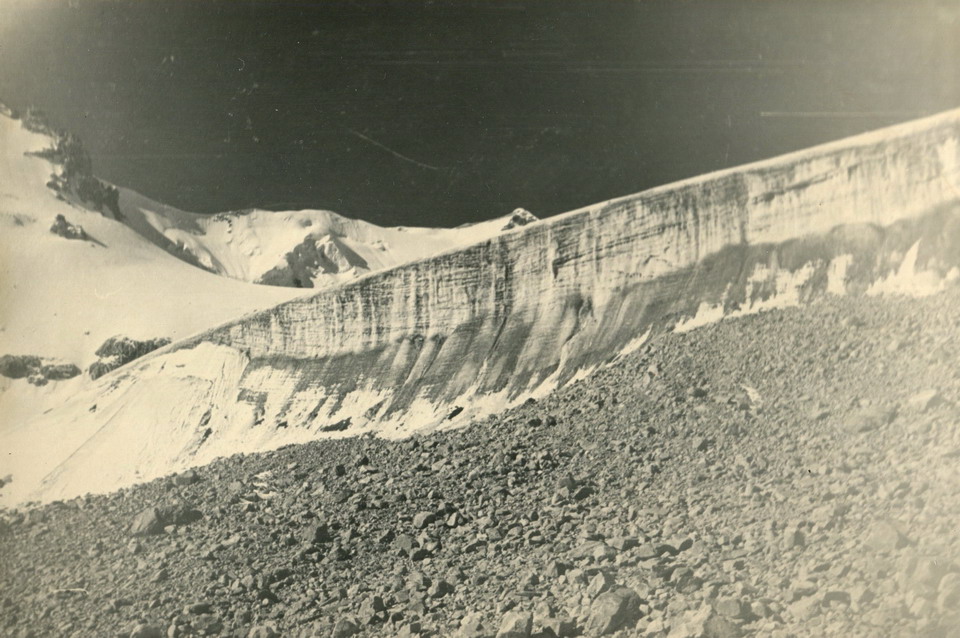 Пока ребята отдыхают и меняют записку в туре, я делаю зарисовки панорамы на ледник Горного института, на перевал Дружных и основного хребта Заилийского Алатау, находящихся в южной стороне. Тогда у меня ещё не было фотоаппарата. На перевал поднялись в 11 часов дня, а вышли в 6 утра. Тяжёлые рюкзаки сдерживают движение, а плечи просят отдыха. Из тура извлекли записку О.А.Шестакова, который вчера поднимался и достиг перевала в 17 часов. Он охарактеризовал перевал сложностью в 2Б. Высота перевала — 4200м. Кроме усталости в ногах и в плечах у меня негативных ощущений не было. Я уже знаю, что при горной болезни болит голова.