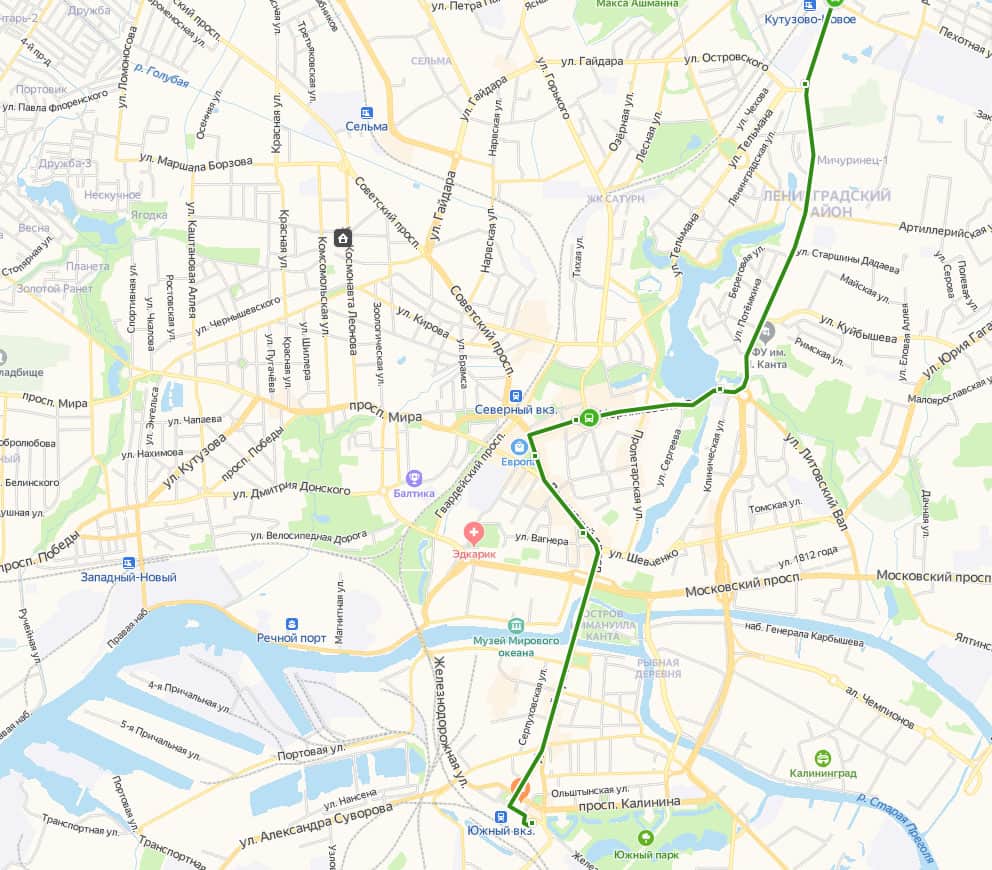 Важно знать, что маршруты из города в аэропорт и в обратном направлении(из аэропорта в город) отличаются. Так из аэропорта в Калининград автобус делает больше остановок(5 в черте города), проходит через центр города(по улицам Черняховского и Ленинский проспект)