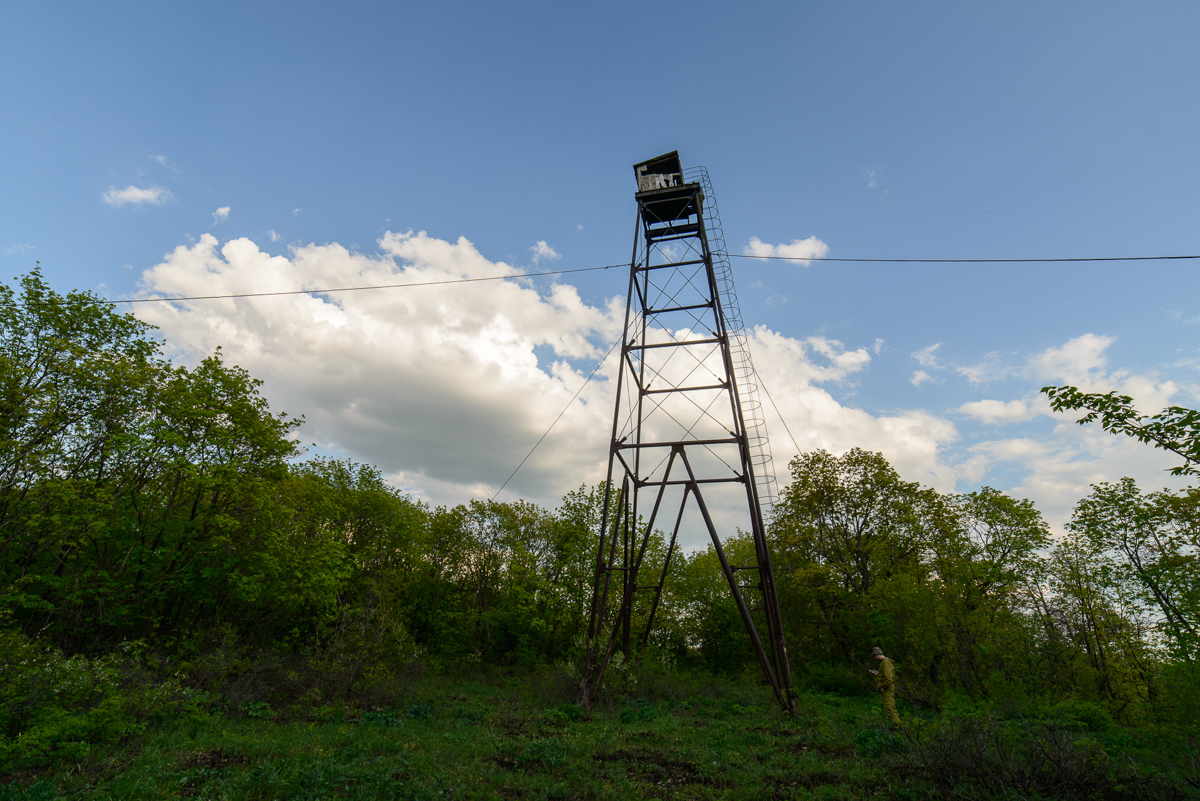 Это место называется Весёлая поляна, причем имя ей дал сам И. И. Спрыгин. Каменное крошево под ногами сменяется небольшими полянками с луговыми травами и редкими растениями. Близится вечер, поэтому времени мы зря не теряем. За леском виднеется 20-метровая пожарная (или наблюдательная) вышка. Перед походом нас предупредили, что доски наверху прогнили, и забираться внутрь опасно.