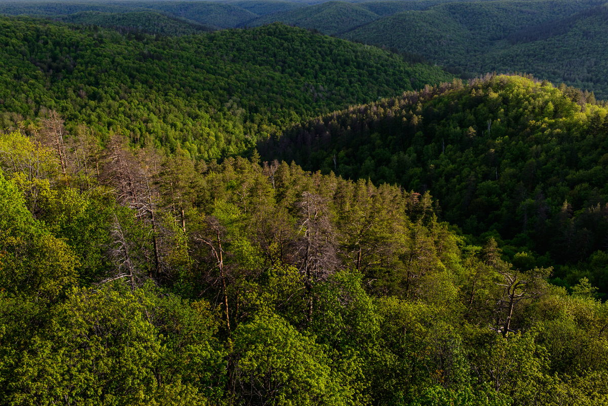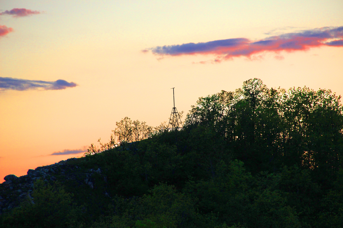 Уже виден просвет впереди, а тропинки все нет. В итоге мы выходим на гору Скалистый уступ, а Большая Бахилова маячит в 150 метрах впереди. Наши горы соединяет лишь чертов мост по левую руку. А закат уже начинается. Делать нечего! Остаемся здесь, благо вид открывается отличный. Мы ставим штатив и начинаем съемку.